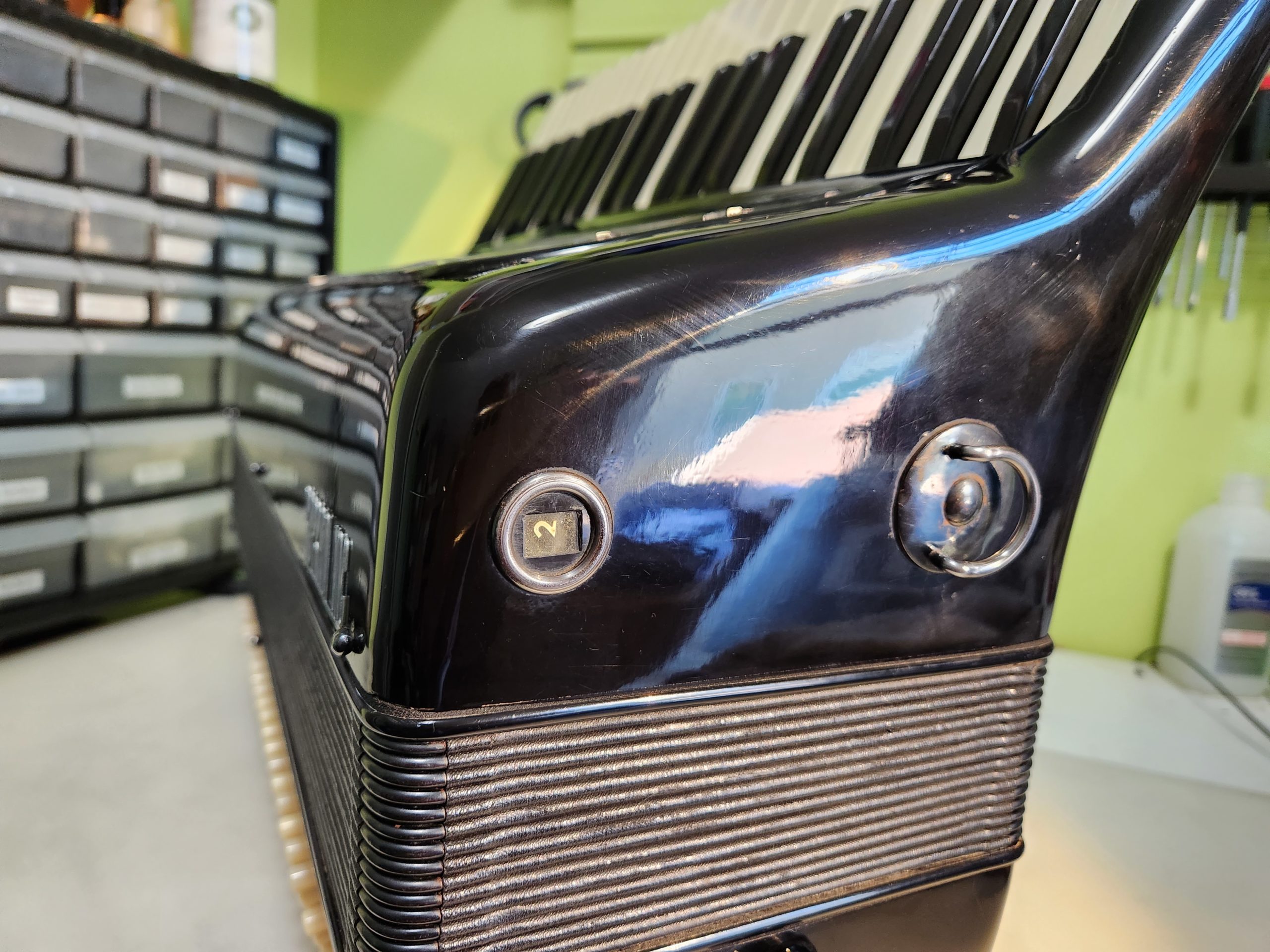 Soprani Inc. Napoli Accordion. Close up of register switch window showing 2 voices of 3 chosen.Soprani Inc. Napoli Register Window